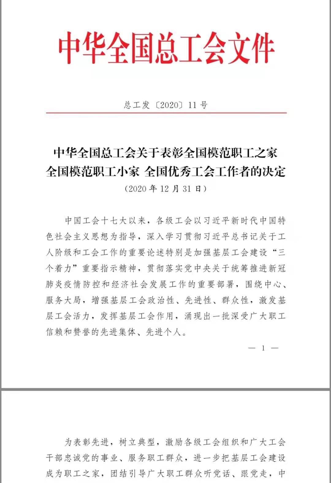 近日,从中华全国总工会表彰文件获悉,澳门永利皇宫官网加工车间工会被授予“全国模范职工小家”荣誉称号。