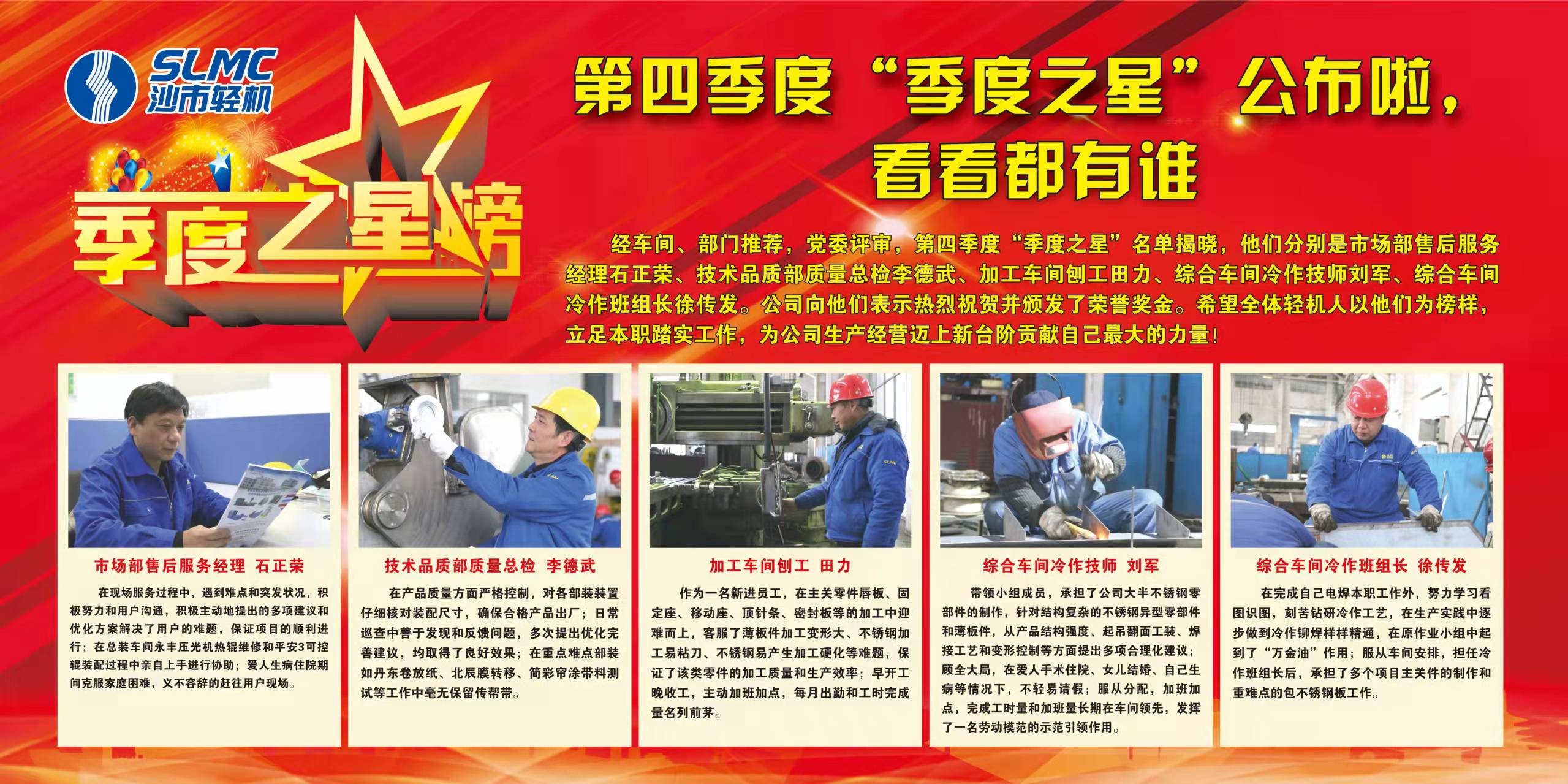 经车间、部门推荐,党委评审,第四季度“季度之星”名单揭晓,他们分别是市场部售后服务经理石正荣、技术品质部质量总检李德武、加工车间刨工田力、综合车间冷作技师刘军、综合车间冷作班组长徐传发。公司向他们表示热烈祝贺并颁发了荣誉奖金。希望全体澳门永利皇宫官网人以他们为榜样,立足本职踏实工作,为公司生产经营迈上新台阶贡献自己最大的力量!